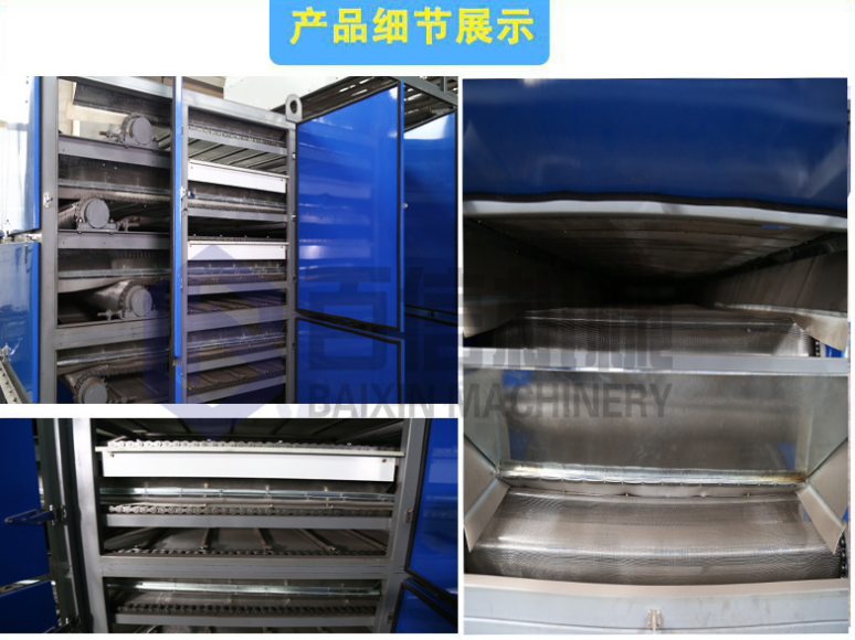 2、每層網帶都裝置擋料和導料板,能夠根據不同堆積密度的物料來調節鋪料厚度,熱質交換均勻充分。