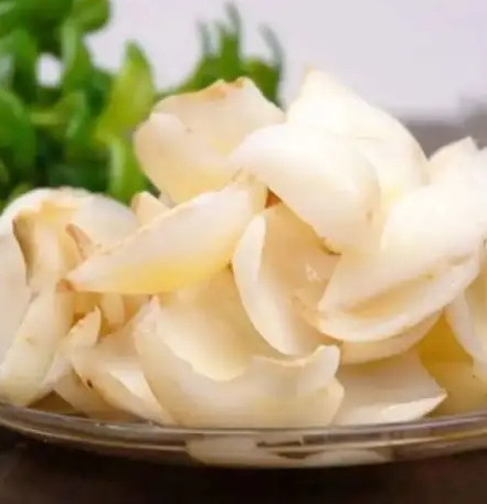 選擇成熟度好、光滑細(xì)膩、果肉肥厚、鱗片大小一致、潔白完好、無(wú)病斑蟲(chóng)眼的鮮百合作原料,用小刀削去百合根基,去除殘根,分片分級(jí)輕輕刷洗后沖洗干凈,用鐵鍋燒好沸水待用,百合鱗片下鍋后,保持水沸,并均勻攪動(dòng)。煮燙的時(shí)間以原料略軟,掰斷鱗片時(shí)有清脆響聲,有較強(qiáng)彈性為度,一般需4~6分鐘。撈出煮燙好的百合鱗片,放入冷水冷卻散熱,然后撈出瀝干備用。